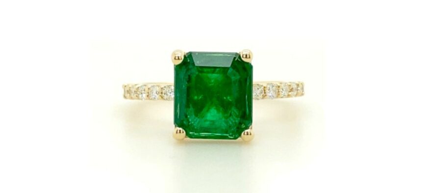 Along with a beautiful emerald center stone, our client wanted to incorporate 10 diamonds on the yellow gold band to represent their 10 years of marriage. We got started by creating CAD images for our client to approve. Once approved we sent the ring for casting and began sourcing his dream emerald center stone.