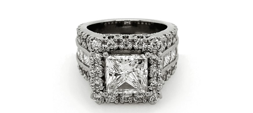 The finished custom 6 carat princess cut halo engagement ring boasting a stunning 3 carat center diamond!